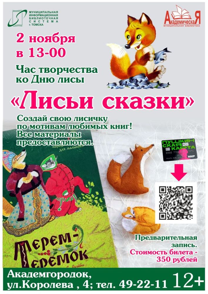 В русском фольклоре лиса издавна считается символом хитрости, ловкости и находчивости, а также воплощает отдельные негативные черты характера человека. День лисы в России подчёркивает значительный вклад этих исконных обитателей лесов в культуру, также помогает привлечь внимание к зоозащитной деятельности. Творческий час поможет участникам погрузиться в образы родной культуры, разгадать их символику и приобщиться к традиционным морально-нравственным ценностям русского народа. Билеты доступны по программе «Пушкинская карта», приобрести их можно здесь. Количество мест ограничено, необходима предварительная запись по телефону: +7 (3822) 49-22-11. 22.10.2025 г.