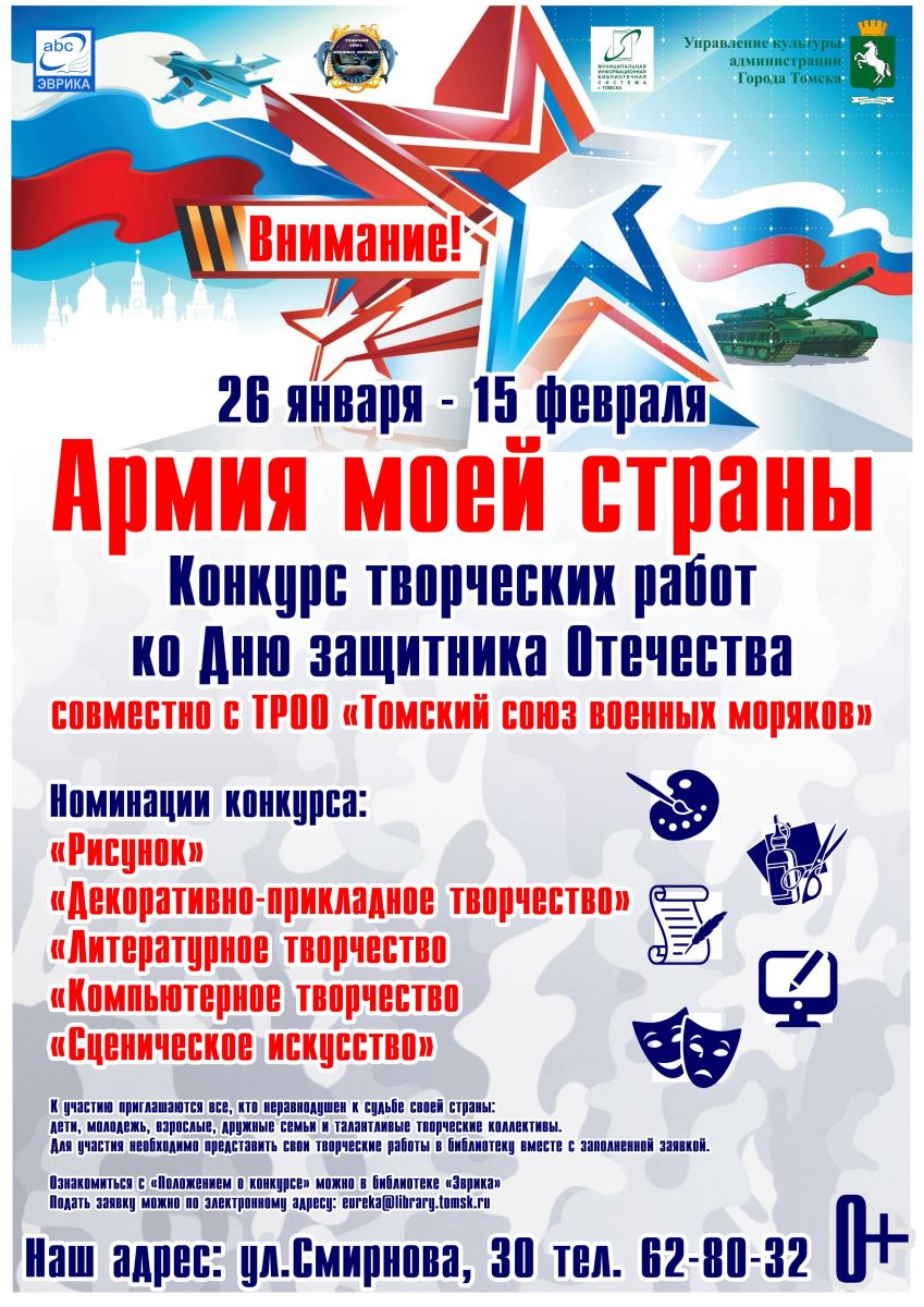 Муниципальная библиотека «Эврика» (ул. Смирнова, 30) приглашает жителей микрорайона Каштак принять участие в конкурсе творческих работ «Армия моей страны», приуроченного ко Дню защитника Отечества. Конкурс проводится при поддержке Томской региональной общественной организации «Томский союз военных моряков».Приём работ продлится до 15 февраля в библиотеке «Эврика». Праздничное награждение победителей и лауреатов состоится 27 февраля.. Ознакомиться подробнее с условиями участия в конкурсе можно на сайте МАУ «МИБС» в разделе конкурсы. 28.01.2026 г.