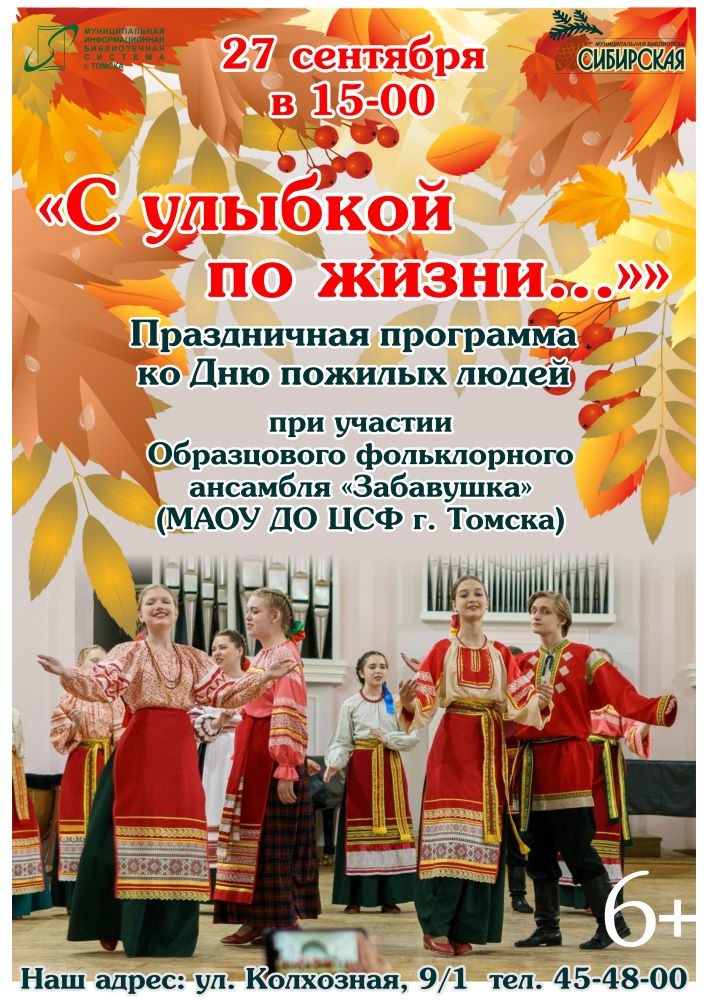 ![]() Для всех желающих прозвучат веселые и лирические песни, инструментальная музыка в исполнении профессиональных и самодеятельных коллективов города (трио «Дуарто», учащихся ДШИ № 3 и др.). Яркими танцевальными выступлениями украсят праздник танцоры ансамбля «Черген» и студии восточного танца «Эстера». Учащиеся школ Томска исполнят стихи отечественных поэтов, посвященные людям старшего поколения. Вход свободный! 27.09.2025 г.