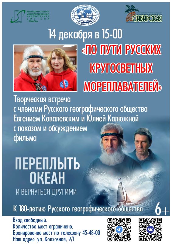 14 декабря в 15.00 в муниципальной библиотеке «Сибирская» (ул. Колхозная, 9/1) пройдёт творческая встреча с членами Русского географического общества Е. Ковалевским и Ю. Калюжной. Организаторы кругосветной экспедиции «По пути русских кругосветных мореплавателей» расскажут о памятных моментах путешествия и представят документальный фильм «Переплыть океан. И вернуться другими».Гостей библиотеки ждёт знакомство с руководителем экспедиции «По пути русских кругосветных мореплавателей» (Russian Ocean Way) Е. Ковалевским и главой Берегового штаба Ю. Калюжной. Без предварительной записи посадочные места не гарантируются! 05.12.2025 г.