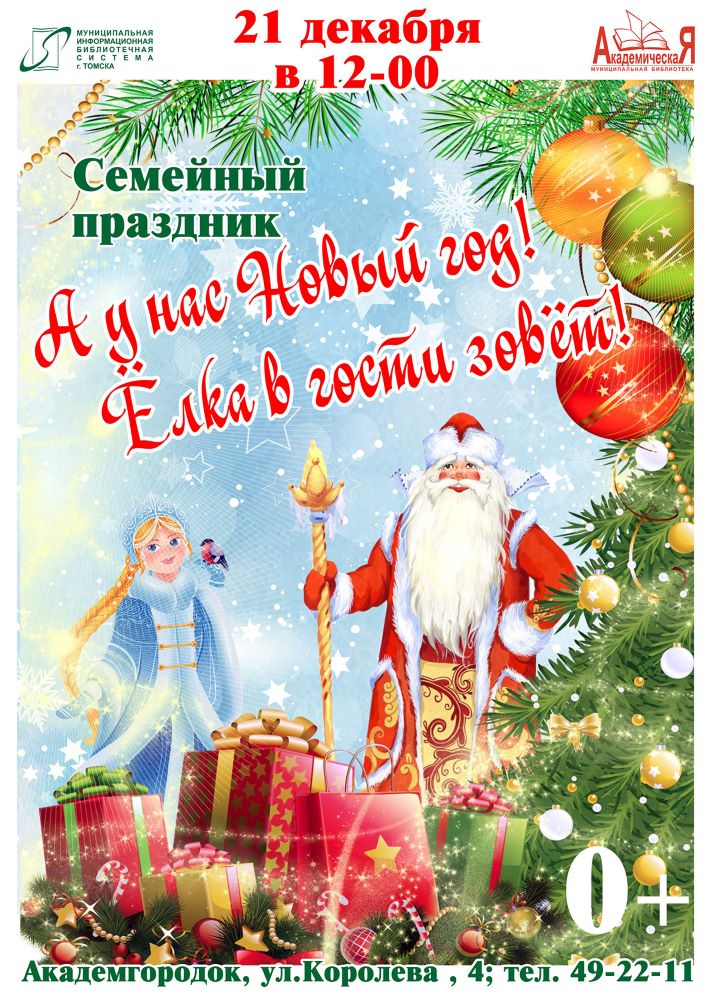21 декабря в 12.00 муниципальная библиотека «Академическая» (ул. Королёва, 4) приглашает на семейный праздник «А у нас Новый год! Елка в гости зовет!». Участников ждёт удивительное путешествие по планете и знакомство с традициями встречи Нового года в разных странах.Команда путешественников побывает на жаркой Кубе, где встретит новогодних кубинских волшебников. Потом ребята и их родители отправятся в солнечную Италию и увидят фею Бефану, после - в загадочный Китай, где познакомятся с Шань Дань Лаодженем, китайским коллегой Деда Мороза и, наконец, вернутся домой в Сибирь, чтобы повеселиться вместе с родным Дедушкой Морозом. Викторины и подвижные игры на празднике будут носить национальный колорит тех стран, в которых «побывают» гости праздника. Вход свободный! Приглашаются все желающие. 10.12.2025 г.
