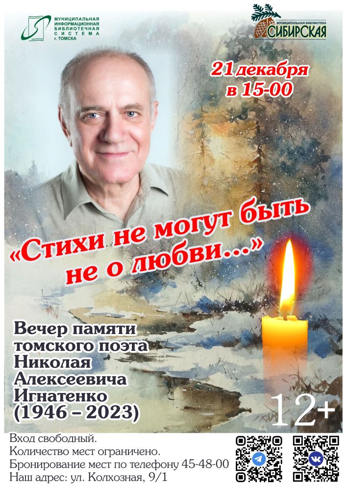 21 декабря в 15.00 в муниципальной библиотеке «Сибирская» (ул. Колхозная, 9/1) пройдёт вечер памяти Н. Игнатенко «Стихи не могут быть не о любви…». С посвящением поэту выступят томские писатели и музыканты, а также Театр им. В. Нилова.Музыкально-поэтический вечер приурочен к 79-летию со дня рождения автора. Мероприятие будет построено в стиле дебютного сборника стихотворений Н.Игнатенко «Три возраста любви»: Юность, Молодость, Зрелость. Зрители услышат рассказ о жизни и творчестве поэта, а также воспоминания близких друзей и коллег по писательскому цеху. Редкие фотографии и видеозаписи из архива поэта помогут оживить его образ в памяти гостей. Вход свободный. Количество мест ограничено. Бронирование мест по телефону 45-48-00 в часы работы библиотеки: вторник – воскресенье с 9.00 до 20.00, или на страницах социальных сетей: Вконтакте, Telegram. Без предварительной записи посадочные места не гарантируются! 15.12.2025 г.