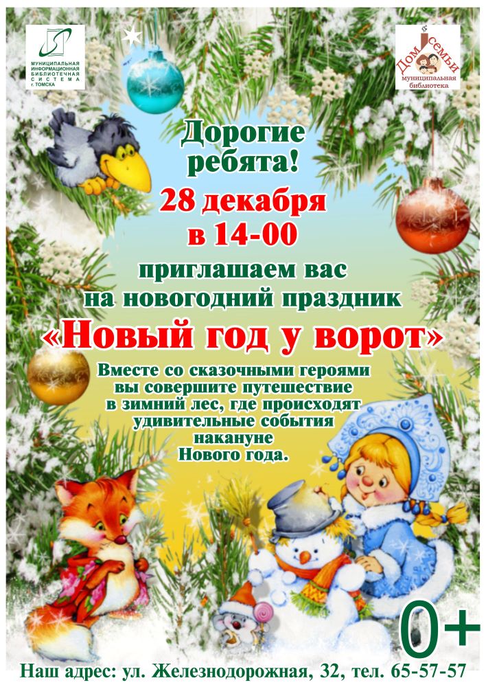 28 декабря в 14.00 в муниципальной библиотеке «Дом семьи» (ул. Железнодорожная, 32) пройдёт семейный новогодний праздник «Новый год у ворот». Гости библиотеки примут участие в праздничном представлении, где каждый сможет почувствовать себя персонажем волшебной истории.Ребята вместе со сказочными героями совершат путешествие в зимний лес, где происходят удивительные события накануне Нового года. Только выполнив каверзные задания Бабы Яги и Шапокляк, участники встретятся с Дедом Морозом и Снегурочкой. А потом будут водить хороводы, петь песни и рассказывать стихи, приготовленные специально для Дедушки Мороза. Новогодние образы приветствуются! В конце праздника все ребята получат призы за карнавальные костюмы. Вход свободный! Приглашаются все желающие. 23.12.2025 г.